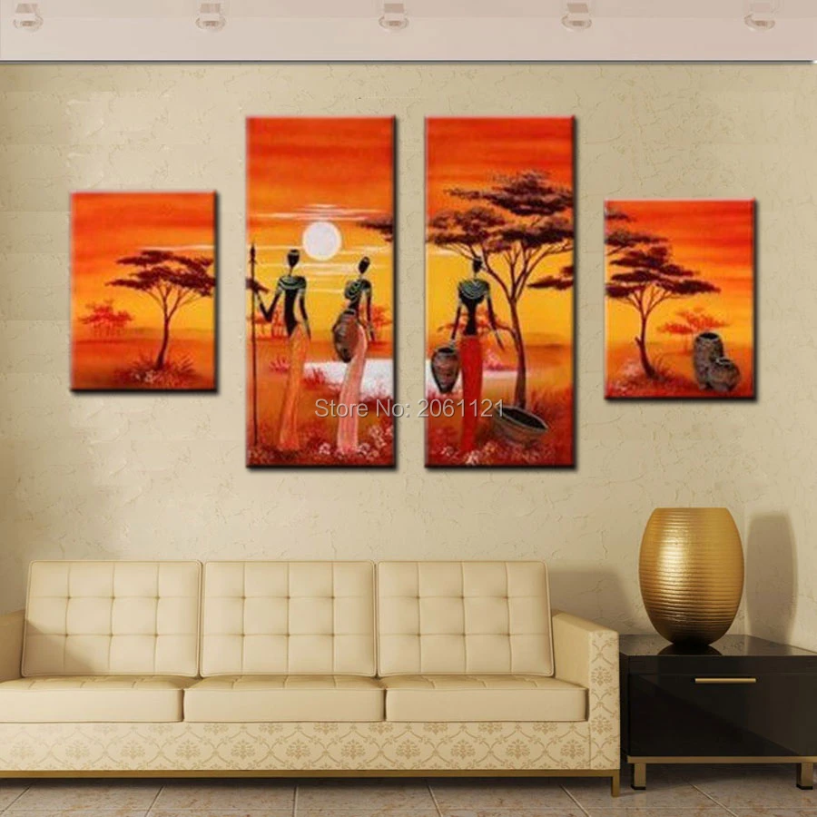 Peinture murale en toile 4 panneaux | Peinture à la main abstraite, femme, vie, femme, mur, orange jaune, décoration, peinture murale | AliExpress